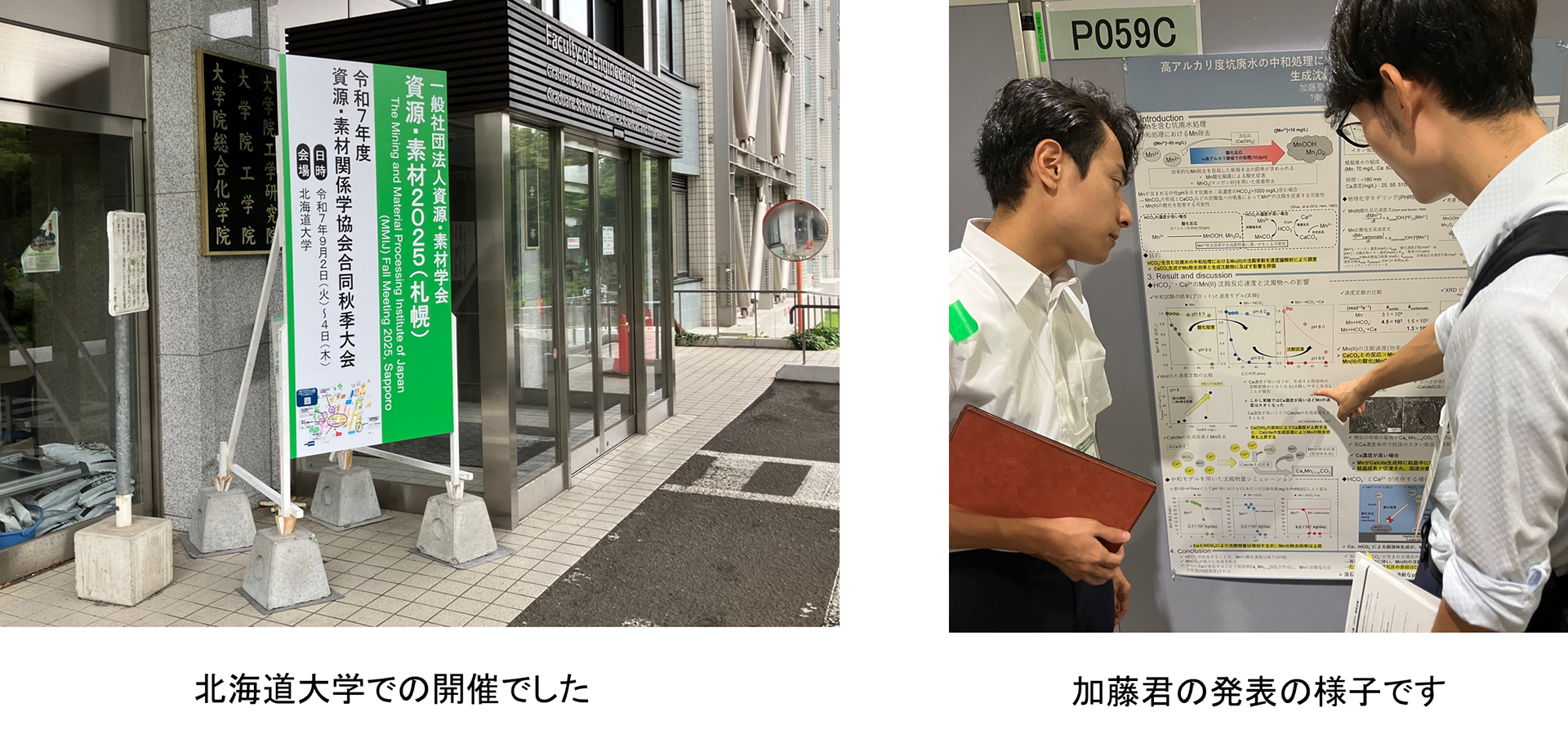 北海道大学で開催された資源・素材学会2025秋季大会に参加しました。ポスターセッションでは修士2年の加藤聖也君が「坑炭酸イオンを含む坑廃水の中和処理におけるCalcite生成とMn除去効率の関係」というタイトルで発表しました。また,同じフィールドを対象に共同研究を行っている牧田研究室・修士1年の伊藤裕基君が「伊達鉱山酸性坑廃水中の鉄酸化細菌が廃水処理に与える影響」のタイトルで発表を行いました。淵田先生は環境セッションで「酸性坑廃水の曝気処理における鉄処理効率に関係する化学条件の考察」,企画講演で「海洋性鉄酸化細菌を用いた銅鉱石の海水浮遊選鉱法」の2件の口頭発表を行いました。加藤聖也君,佐々木直哉君,伊藤裕基君は資源塾のOBOGセッションにも参加し,ポスター発表を行い非鉄金属資源企業関係者と交流を深めました。